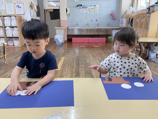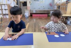 お月見団子の制作遊びを楽しみました。画用紙で作ったお団子を上手に貼りながら「これなーに?」「おいしそ~う!」とお友だちや先生たちと楽しんでいましたよ!出来上がった作品を飾っているのを見て自分のはどれだろう?興味をもって見ている姿がとてもかわいかったです♡