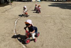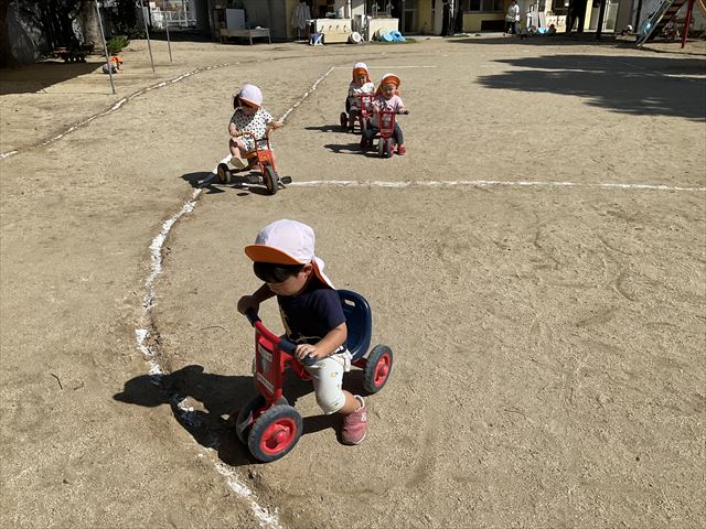 身体を動かして遊ぶ事が楽しくなってきました。園庭に出ると滑り台や鉄棒を指さして「あれがいい!」と言って遊具に挑戦しする姿が見られます。中でも三輪車が人気で自分の順番が来るととても嬉しそうに乗っています♪