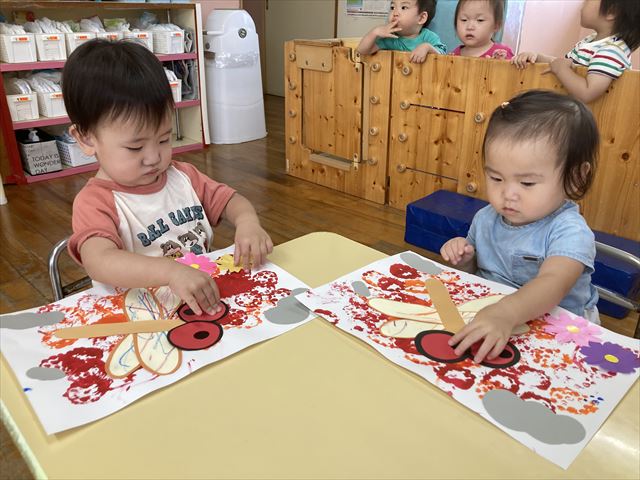 暑さも和らいできて、外遊びを楽しんでいる子ども達。空を飛んでいる「とんぼ」を指差して喜んでいます。お部屋では「とんぼ」の制作。絵の具を使って夕焼け空を表しました。「とんぼさんの目はここだよ」と言うと赤色眼鏡の部分に黒シールを貼ってくれました。かわいいトンボさんの完成、またみんなでお外で見つけてみようね♡