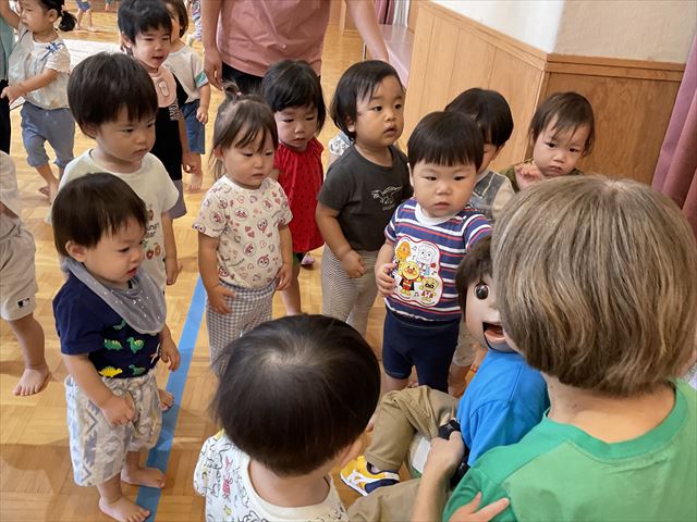 えっちゃんのお話会に参加しました。絵本を見たり、季節の歌を歌ったりして楽しんだ後は、おまちかね“ぐりちゃん”の登場!お部屋に戻る前にはぐりちゃんとご挨拶で、自分から進んで握手やハイタッチをする子、ちょっと怖いなと様子を見ている子と様々でした。来月のお話会も楽しみだね~。