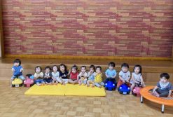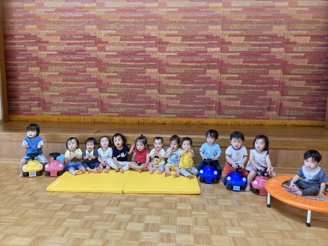 ホールの遊具で遊びました。自動車に乗ったり、トランポリンに乗ったりと様々な遊具に挑戦しています。歩行も安定してきて、足をあげて乗ったり、バランスを取ったりと成長している様子がしっかりと見えています。最後はみんなで記念撮影、次はどんな遊びをしてみようかな?
