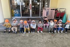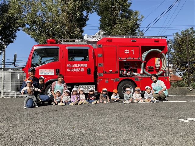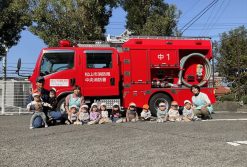 避難訓練に参加しました。歩行も上手になってきたあひる組さん、先生の後についてしっかりと避難する事ができました。訓練後は消防車の前で記念撮影、大きな消防車を間近で見て、目を丸くしたり、声を出したり喜んでいました。大きくなったら消防士さんになりたい…と夢を持つ子もいるかもしれませんね!