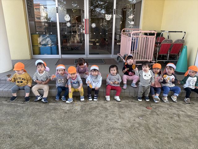 クラスで芋ほりごっこをしました。「抜けたよ!」「見て!」と抜いたお芋を保育者や友だちに見せてくれる姿がありました。立ち上がって抜こうとしたり、横に引こうとしたり色々な方向から抜きながら楽しんでいました。