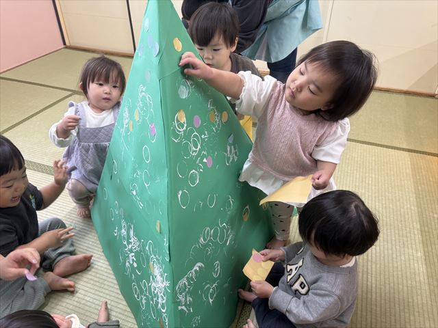 お楽しみ会に向けて、クリスマスツリーの制作をしました。ペーパー芯を使って絵の具スタンプをしたり、シールを貼ったりとみんなで楽しんで行いました。素敵なクリスマスツリーの完成。素敵なクリスマス会ができそうだね☆