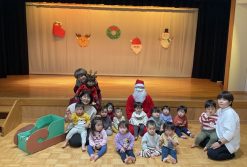 みんなが楽しみにしていたクリスマス会、クリスマスのお話を聞いたり、先生たちによる演奏を聞いたりして楽しみました。サンタさんの登場にちょっと緊張した様子もありましたが、プレゼントをもらうとみんなニコニコ笑顔、とっても嬉しそうでした。毎日がクリスマスならいいね~☆