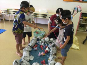 池の中には、タコやイカ、魚やクラゲなど子ども達が作った物も一緒に入れて釣り上げていました。