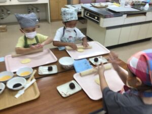 パン生地を綿棒でのばして、あんこを包んでいきました。
