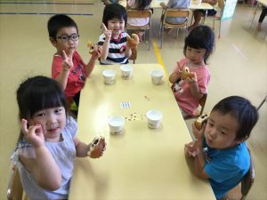 その後も字が抜けているクイズでした。「○まって ○って ○とびださない」 この○のところに入れる言葉は「とまと」 「とまって まって とびださない」でした。今まではは3本指のお約束「ぼくは わたしは かならず 止まります。」が多かったので、今回のとまとのお約束も今日しっかり覚えたいと思います。