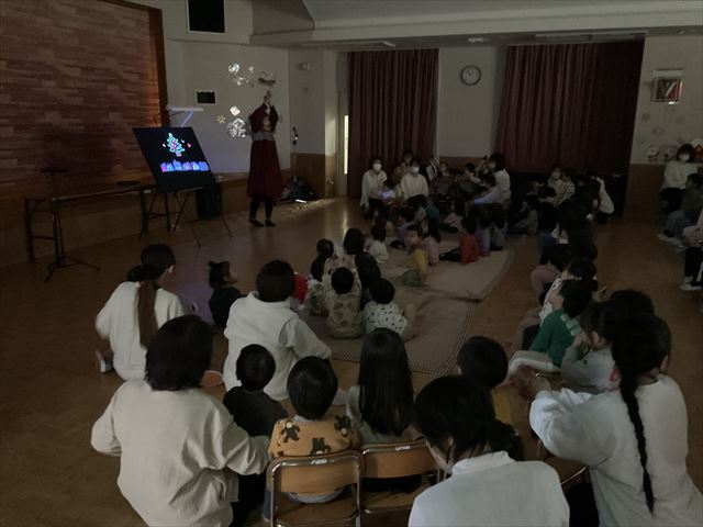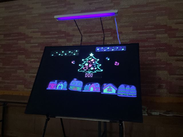 最後には、ブラックライトのパネルシアターを見ながらクリスマスソングを歌って楽しみました。