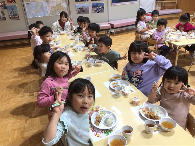 お待ちかねの給食は、3歳以上児は、ホールでバイキング形式で食べました。
