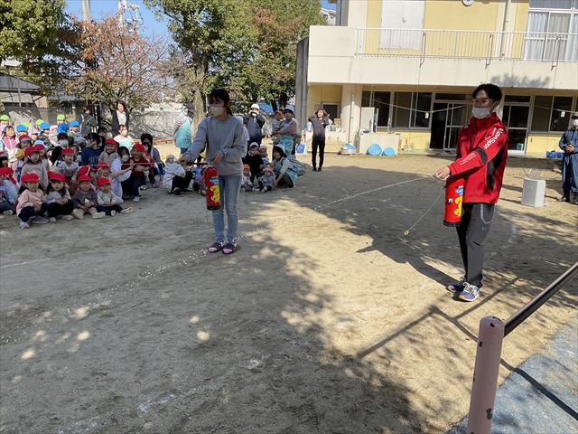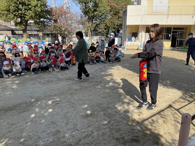 子ども達も一緒に大きな声で「火事だ」と言って伝える練習をしました。