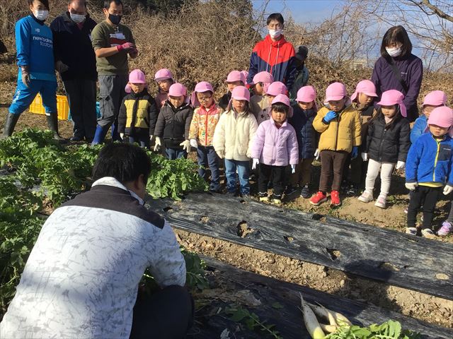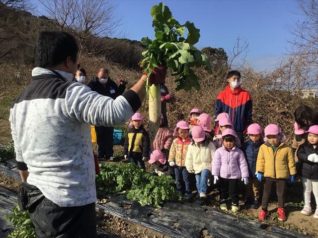 大根の収穫の仕方を丁寧に教えて頂き、子ども達真剣に話を聞く姿が見られました。