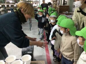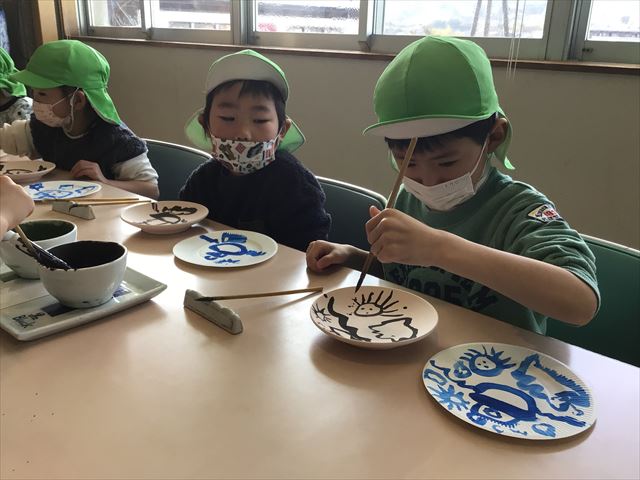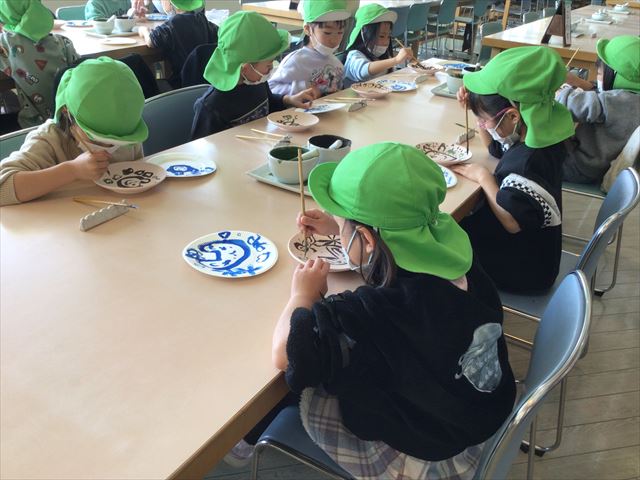 1月28日 年長児が「砥部焼観光センター炎の里」へいき、お皿に絵付け体験をしてきました。