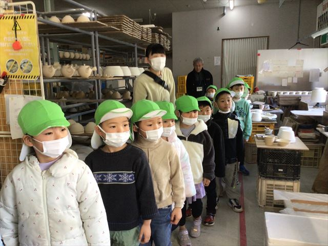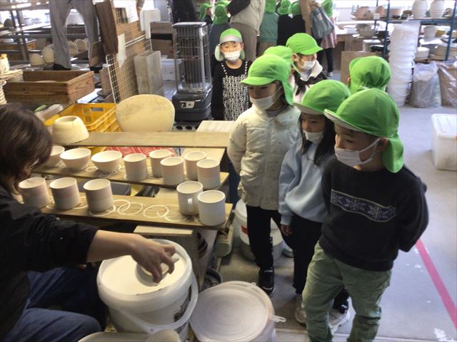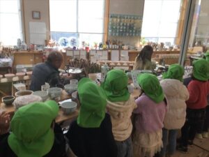 途中、ろくろを回してお皿を作っていたり、色を付けたりしている職人さんに「何を作っているの?」と質問をしながら交流をしていきました。