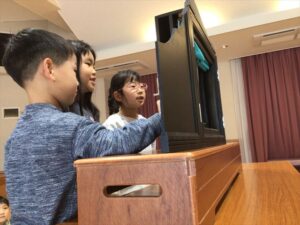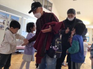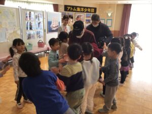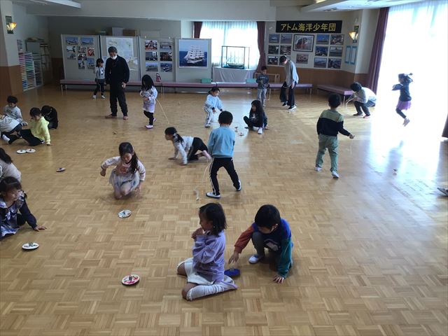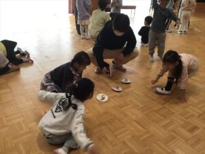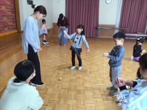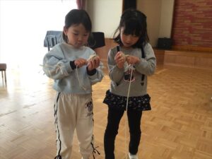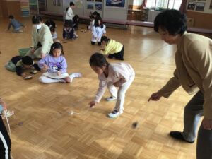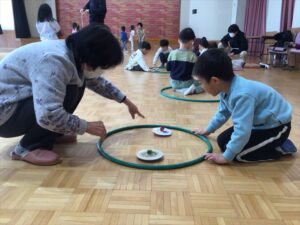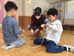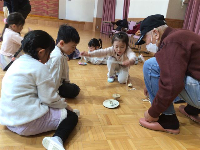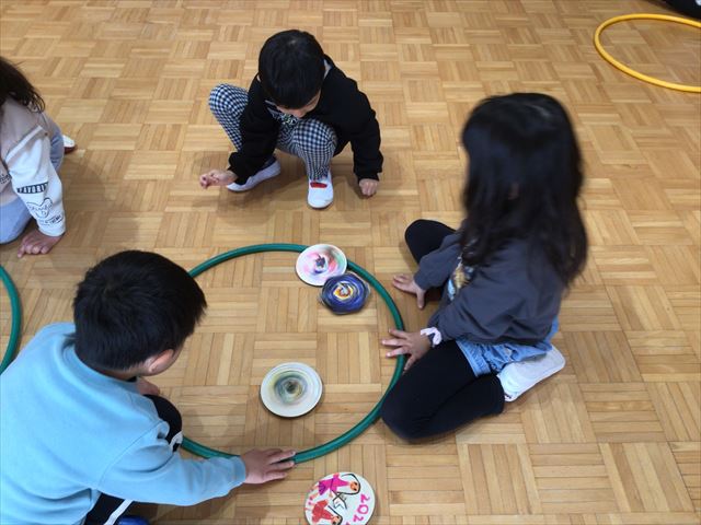 ひもの巻き方から、回し方までじっくり丁寧に教えてくれたので、すぐに回せるようになる子がいました。楽しくて時間が過ぎるのがあっという間でした。最後に、みんなで一斉に回して誰が一番かを競って楽しみました。優勝はやっぱりコマ名人!!「次は勝ちたいなあ」と話す子ども達でした。