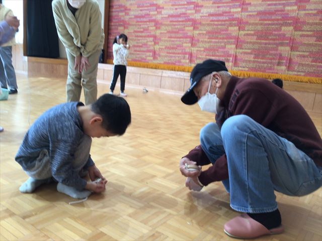その後は、コマ名人のおじいちゃん達にコマの回し方を教えて貰ったり、一緒に回して楽しみました。