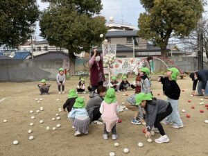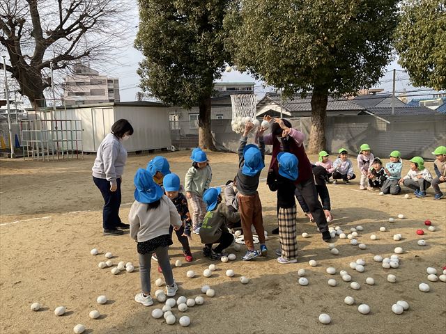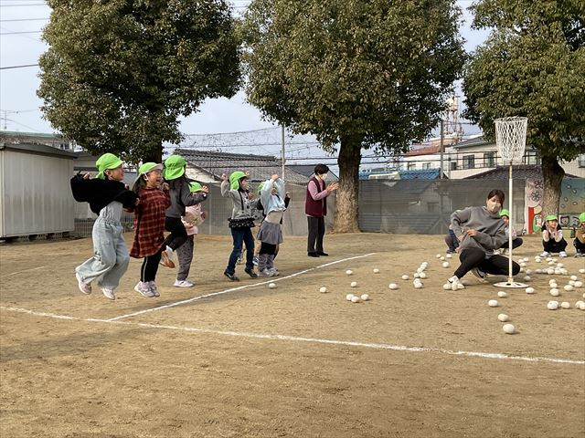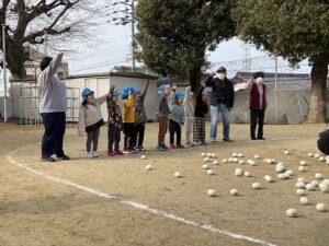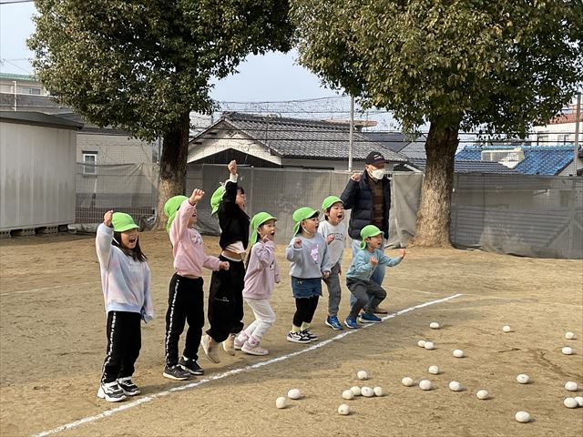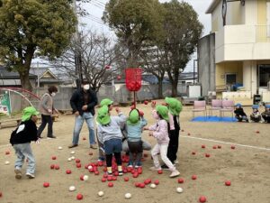 今日は、園庭で一緒に玉入れをしましたよ。