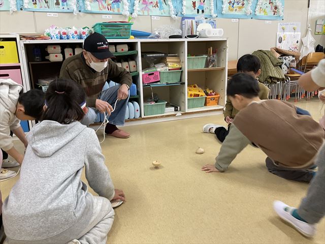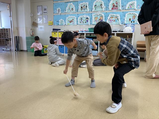 身体を動かして楽しんだ後は、年長クラスで、前回名人にコマまわし大会で負けたリベンジを込めて、コマまわしを行いました。